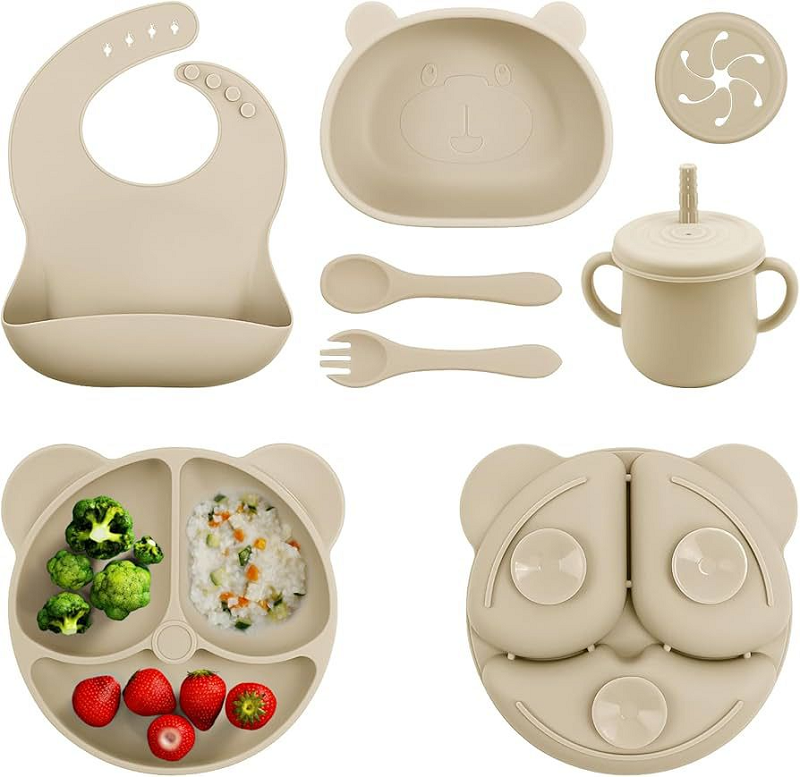 Complete feeding kit: suction cup dividers, spoon, fork, straw cup, and bib for easy feeding and cleanup