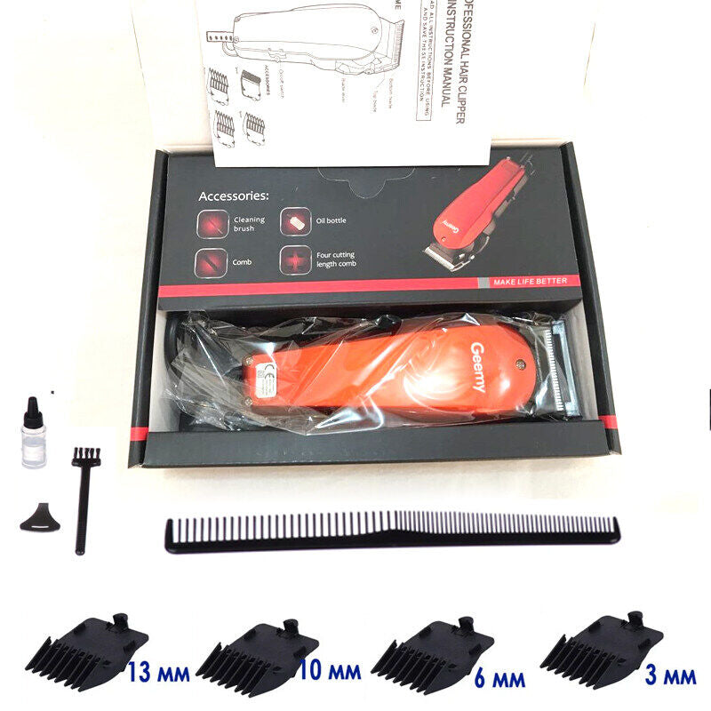 Gemei professional hair clipper is excellent for personl to heavy-duty cutting tapering fades and blends equipped with new innovative motor wich runs faster and cooler with 40% more cutting power this comes complete with a blade guard 4 attachment combs small flat tob comb cleaning brush clipper oil and an instruction booklet .