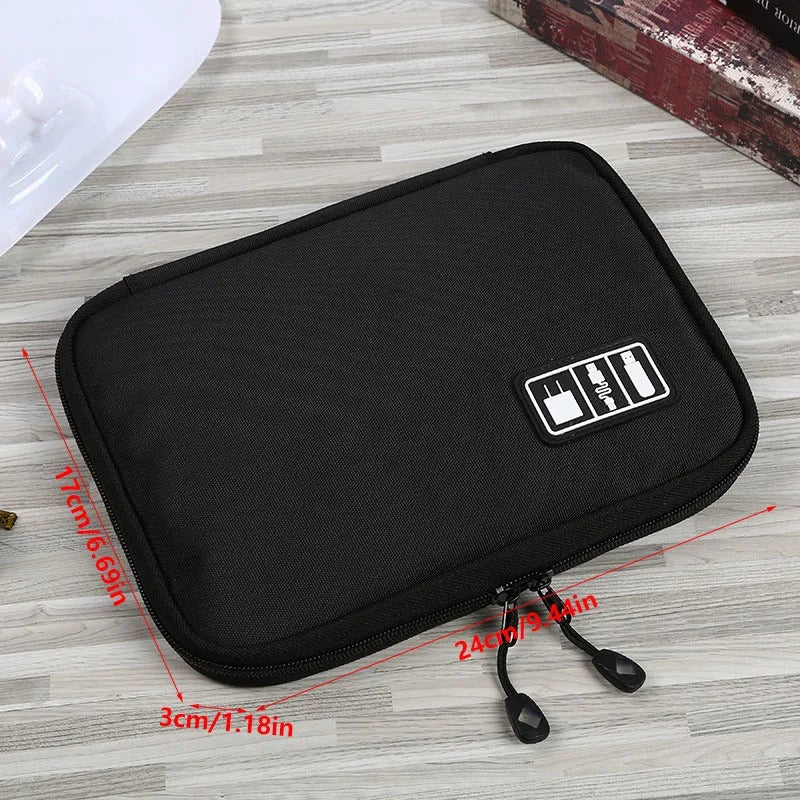 - Size: L:24cm x W:17cm x H:3.2cm(9.4 inch x 6.7 inch x 1.2inch). Designed for electronics accessories organizing purposes: small multifunctional cable bag, elegant and light, easy to carry, very suitable for travel. includes cables, memory cards, hard drives, mobile power, USB cables, scissors.