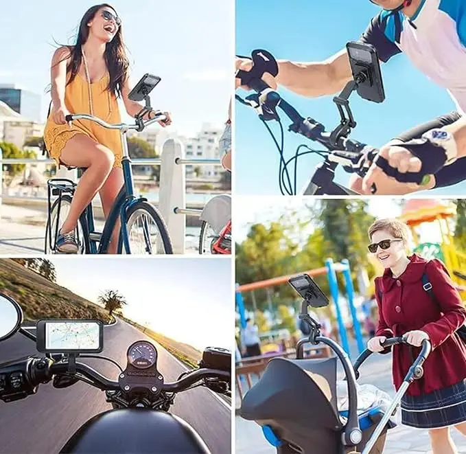 1【Waterproof & Charge】The bicycle phone bracket adopts professional seal loop which can provide IPX4 grade waterproof performance. It absolutely prevents rain, snow and mud from splashing on your phone, so completely protects your phone. Even if fully enclosed design,there are two reserved holes at the bottom for you to charge and listen to music while riding.